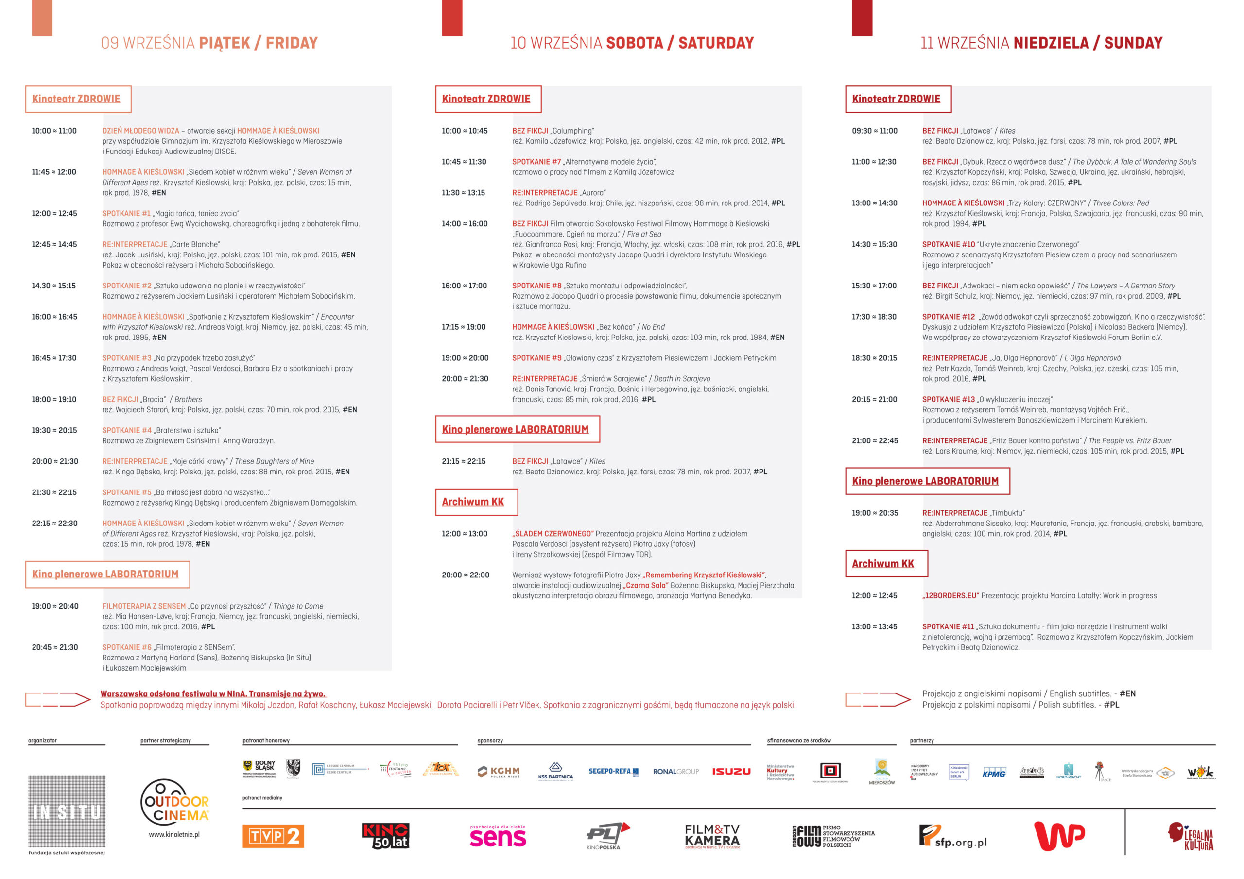 Projekcje i panele dyskusyjne odbywały się w kinoteatrze „ZDROWIE”, kinie plenerowym „LABORATORIUM” i w sali multimedialnej mieszczącej się w wyremontowanej części zabytkowego sanatorium dr. Brehmera.